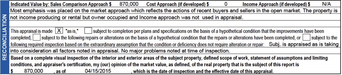 Below are the pertinent portions of the current appraisal performed on April 15, 2015