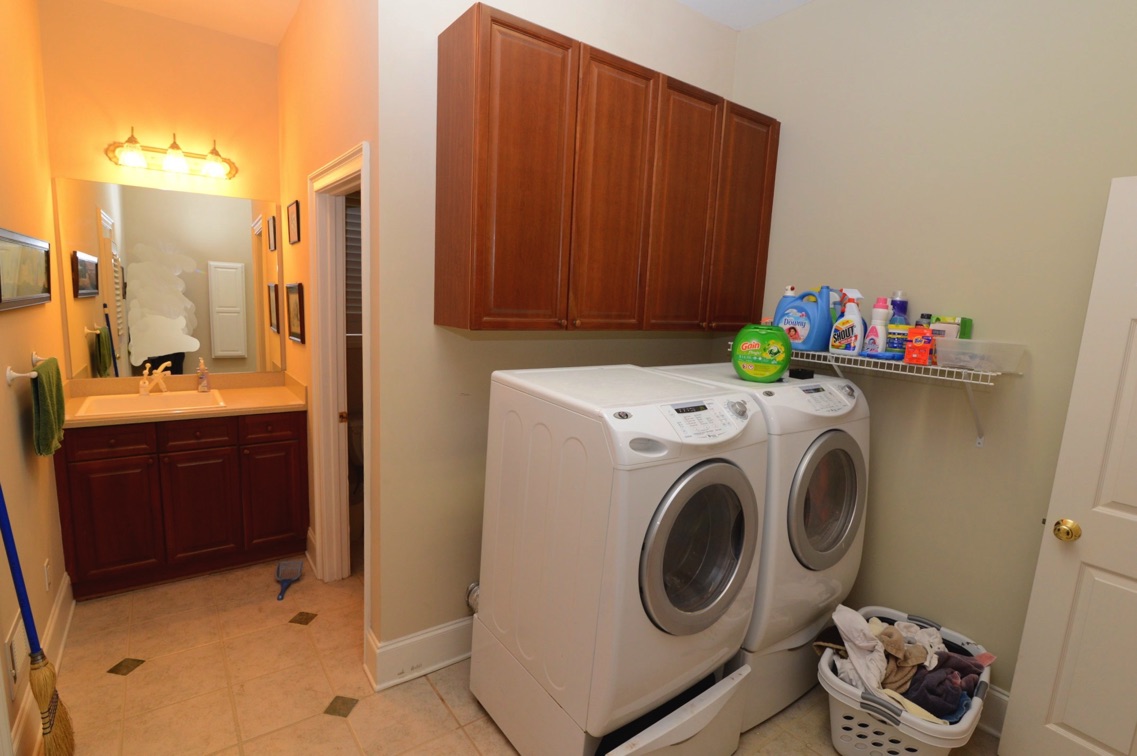 The laundry room, conveniently located right off the kitchen, also has a half-bath