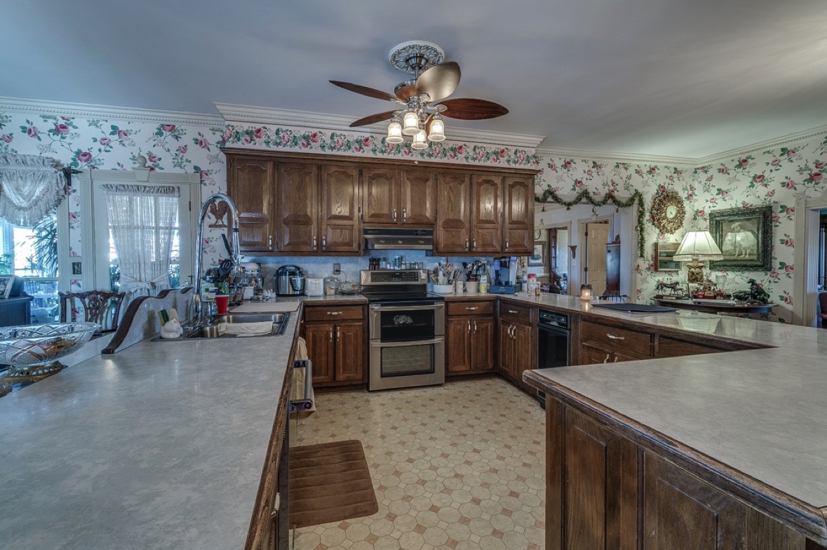 The kitchen is efficiently laid out with lots of counterspace with bar seating. There is a breakfast area with a door to the sunroom and back patio. This is a large kitchen that will easily allow the Chef in you to expand.